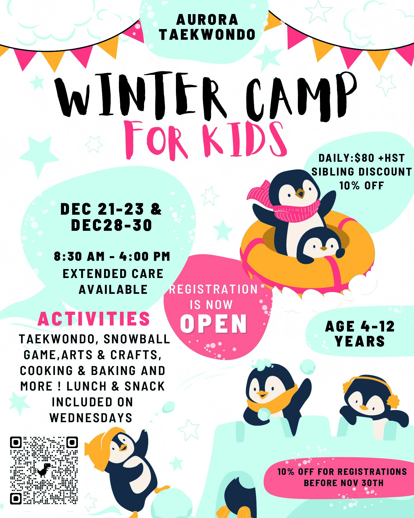 Each day includes Taekwondo training, exciting games, Nerf battles, arts & crafts, cooking, and interactive indoor activities.